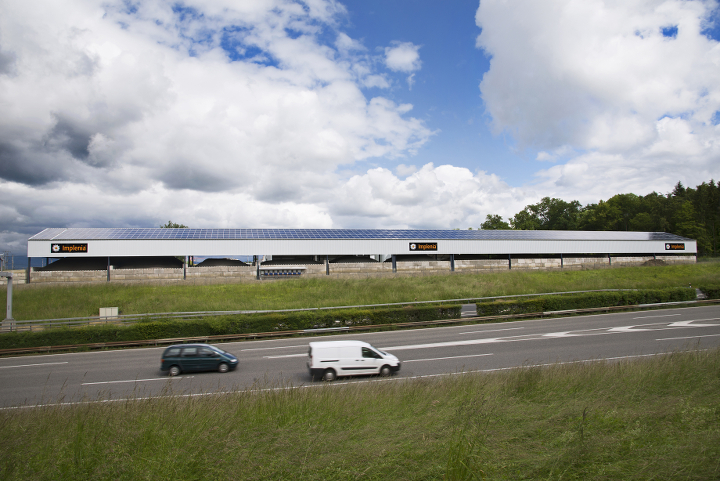 Von der Autobahn A1 aus ist die 2500 m2 grosse, auf dem Dach des Belagswerks installierte Photovoltaikanlage sichtbar. Sie produziert jährlich mehr als 300‘000 kwH Solarstrom. (Bild: Implenia)