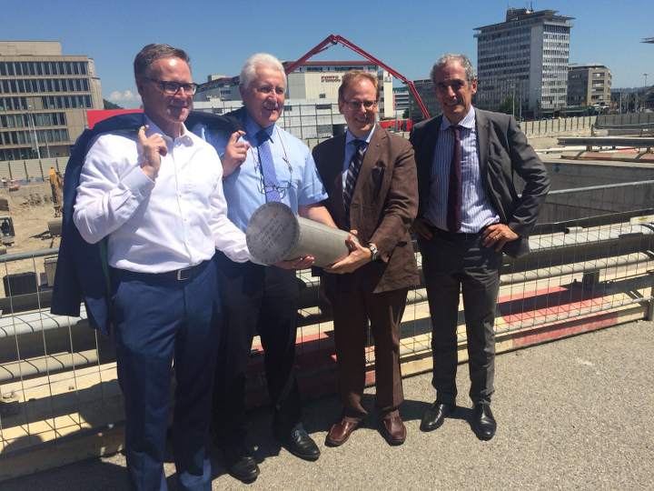 Implenia feiert mit Bauherrschaft und Behördenvertretern Grundsteinlegung zur Grossüberbauung Pont-Rouge – Eines der grössten Immobilienprojekte in der Region Genf – Implenia kombiniert Kompetenz im Tief- und Spezialtiefbau und als Totalunternehmerin Donnerstag, 23. Juni 2016 - 13:15