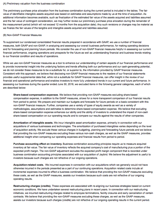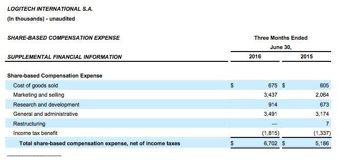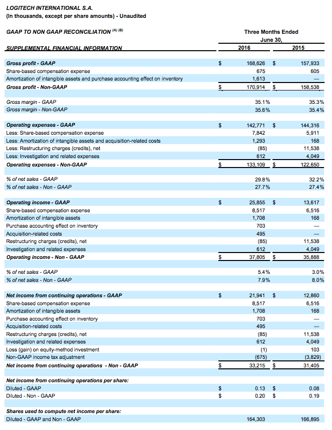 To facilitate comparisons to Logitech’s historical results, Logitech has included non-GAAP adjusted measures, which exclude share-based compensation expense, amortization of intangible assets, purchase accounting effect on inventory, acquisition-related costs, restructuring charges (credits), gain (loss) on equity-method investment, investigation and related expenses, non-GAAP income tax adjustment, and other items detailed under “Supplemental Financial Information” after the tables below. Logitech also presents percentage sales growth in constant currency to show performance unaffected by fluctuations in currency exchange rates. Percentage sales growth in constant currency is calculated by translating prior period sales in each local currency at the current period’s average exchange rate for that currency and comparing that to current period sales. Logitech believes this information, used together with the GAAP financial information, will help investors to evaluate its current period performance and trends in its business. With respect to the Company’s outlook for non-GAAP operating income, most of these excluded amounts pertain to events that have not yet occurred and are not currently possible to estimate with a reasonable degree of accuracy. Therefore, no reconciliation to the GAAP amounts has been provided for Fiscal Year 2017.