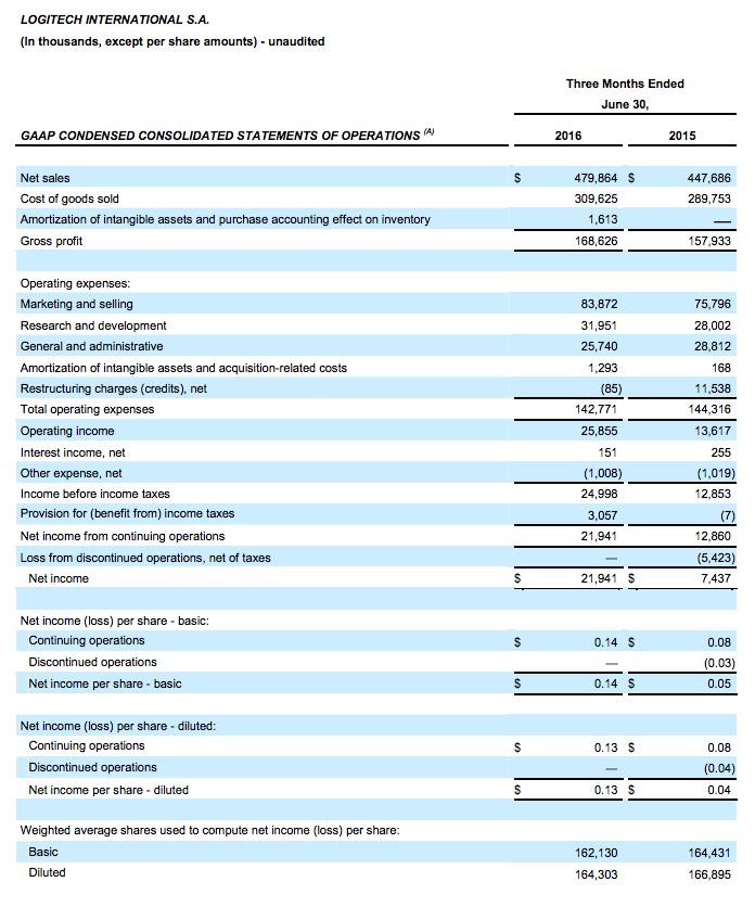 NEWARK, Calif. — July 27, 2016 and LAUSANNE, Switzerland, July 28, 2016 — Logitech International (SIX: LOGN) (Nasdaq: LOGI) today raised its outlook for sales and operating income following better-than-expected financial results for the first quarter of Fiscal Year 2017.