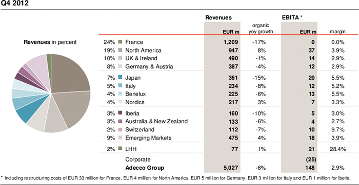 Revenues in France amounted to EUR 1.2 billion, down 17% compared to Q4 2011. Permanent placement revenues were down 29%. In the quarter under review, EBITA was at break-even. Excluding EUR 33 million restructuring costs incurred in Q4 2012, the EBITA margin was at 2.7%, compared to 4.3% a year ago. The combination of the business of the Adecco and Adia brands under the single brand of Adecco is nearly complete.