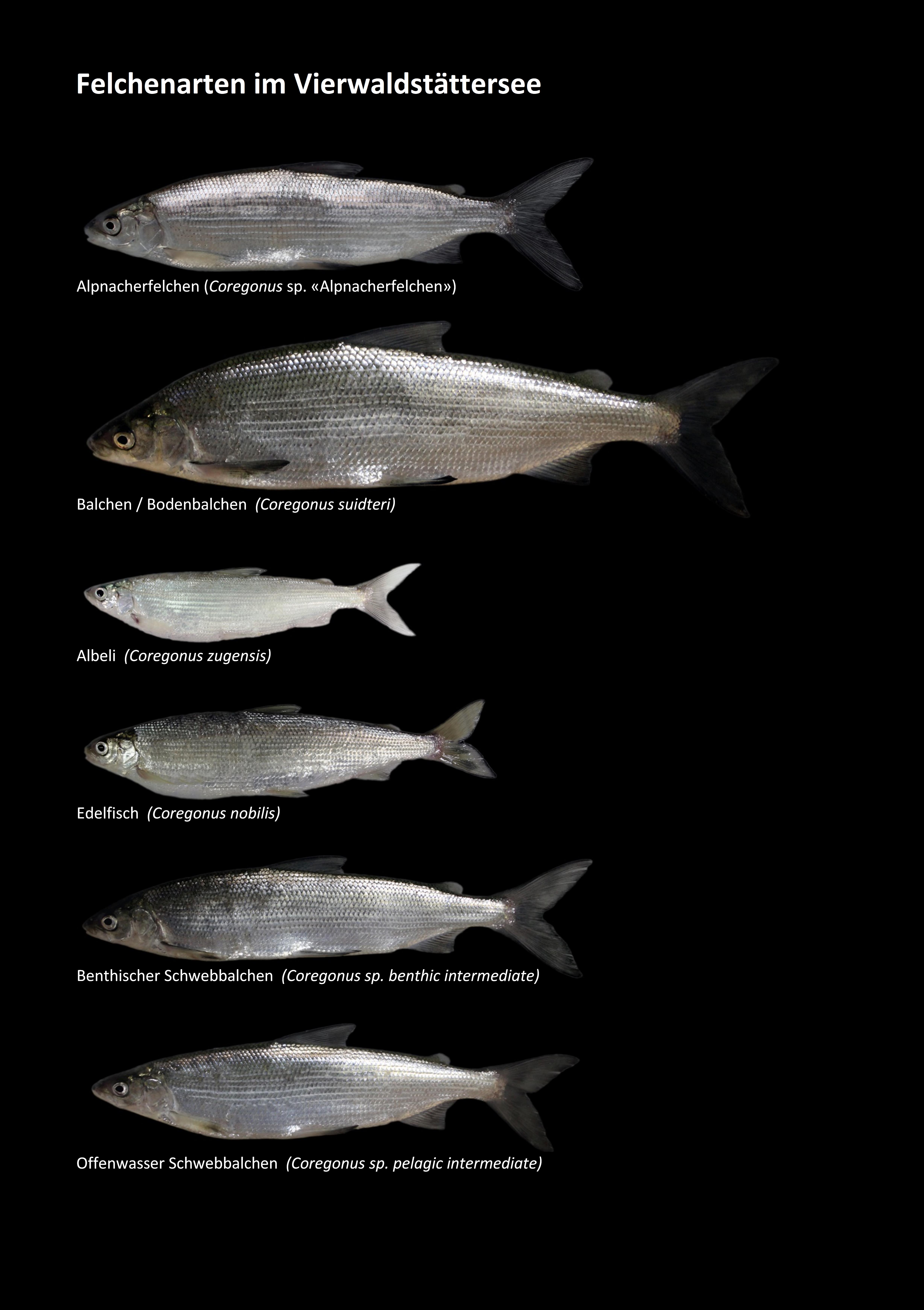 Bisher waren offiziell vier Felchenarten im Vierwaldstättersee bekannt, die sich in Grösse, Gestalt, Laichtiefen und Laichzeit unterscheiden: Balchen (Bodenbalchen), Albeli, Edelfisch und Alpnacher Felchen. Schon 2009 haben Eawag-Forschende eine fünfte Art identifiziert, die in Wassertiefen zwischen den Balchen (bis rund 10m) und den Albeli (ab etwa 40m) laichen. Wegen dieser dazwischenliegenden Laichtiefe trägt die Art bisher inoffiziell den Namen «Schwebbalchen». Jetzt hat die Gruppe um Prof. Ole Seehausen, Leiter der Abteilung Fischökologie und -evolution der Eawag und Professor für aquatische Ökologie & Evolution an der Universität Bern, noch eine sechste Art identifiziert. Alle sechs Arten unterscheiden sich genetisch, aber auch in Wachstum und Laichverhalten, die meisten auch im Aussehen und in der Zahl der Kiemenreusendornen. Erstaunlicherweise laicht die zuletzt identifizierte Art in nächster Nähe zu den Schwebbalchen, schwimmt jedoch deutlich mehr im freien Wasser weiter im See draussen. Einen Namen, auch einen provisorischen, hat sie noch nicht. Dass nun noch eine weitere Felchenart im Vierwaldstättersee identifiziert wurde, zeige, so Seehausen, wie wichtig unvoreingenommene Bestandesaufnahmen mit quantitativen genetischen und morphologischen Methoden seien. Nur so könne man die evolutionären Mechanismen verstehen, die zur aktuellen Biodiversität geführt hätten und nur so könnten Schutz- und Bewirtschaftungsmassnahmen verbessert werden.
