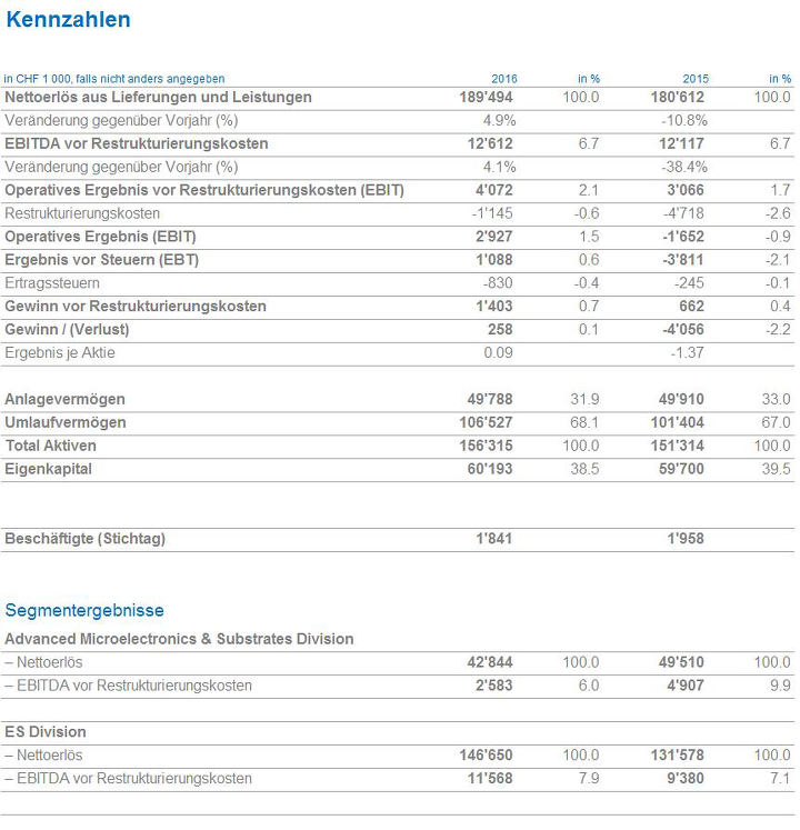 Nachdem die ES Division in 2015 unter der starken Aufwertung des Schweizer Frankens gelitten hatte, konnte 2016 mit CHF 146.7 Mio. (2015: CHF 131.6 Mio.) der höchste jemals erzielte Umsatz verbucht werden. Dies entspricht einem Anstieg von 11.5 % gegenüber dem Vorjahr. Das operative Ergebnis auf Stufe EBITDA (vor Restrukturierungen) wurde trotz der Aufwände für den Werksumzug in der Schweiz um 23.3 % auf nunmehr CHF 11.6 Mio. gesteigert. Die EBITDA-Marge (vor Restrukturierungen) der Division liegt mit 7.9 % um 0.8 Prozentpunkte über dem Vorjahr.