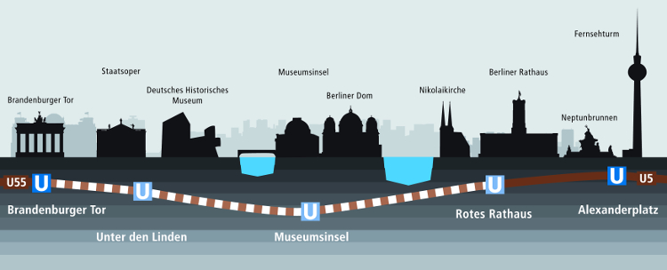 Das Projekt „Neue U5“ umfasst die Verlängerung der bestehenden Berliner U-Bahnlinie 5 über den Alexanderplatz hinaus bis zum Brandenburger Tor und die Zusammenführung mit der bereits fertigen U-Bahnlinie 55. Damit wird aus U5 und U55 eine Linie: die neue U5, die dann von Hönow bis zum Hauptbahnhof fährt. (Bild: BVG)