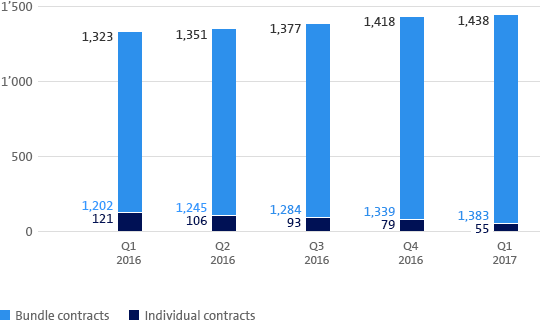 The bundled products, combining fixed-line, broadband and TV, have maintained their popularity. At the end of March 2017, over 1.7 million customers were using a bundled package, which represents an increase of 18.6% year on year. Revenue from bundled contracts increased by 12.1% to CHF 676 million. inOne is a new and innovative Swisscom service which combines broadband, Swisscom TV, fixed-line and mobile flat rates for up to five people, but also has the option to modify or entirely remove each element to suit personal needs. inOne will counter the decline in subscriber growth.