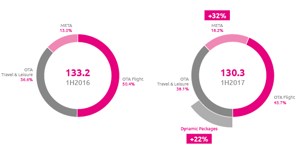 Aus geschäftlicher Perspektive wurde bei dynamischen Angebotspaketen ein zweistelliges Wachstum (22 % Umsatzplus) in allen Ländern erzielt. Heute sind die dynamischen Angebotspakete die erfolgreichste Kategorie im OTA-Geschäft. In Grossbritannien ist dies das am meisten verkaufte Produkt der Gruppe. In Frankreich konnten die Erträge aus Reiseveranstalterpaketen um 20 % gesteigert werden. Andererseits leiden stärker standardisierte Produkte noch immer. Insbesondere das Fluggeschäft, das nach wie vor über 40 % des Gesamtumsatzes der Gruppe ausmacht, wird durch gesunkene Margen aufgrund der Dynamik des Wettbewerbs und der veränderten rechtlichen Bedingungen beeinflusst. Dies belegt ein spürbarer Rückgang der Umsatzerlöse in dieser Kategorie.