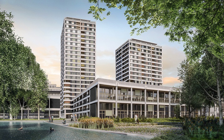 In Zürich Oerlikon entsteht ein Quartier im Quartier. Mit dem WolkenWerk realisiert Implenia als Generalunternehmerin drei Wohnhochhäuser mit mehr als 300 Wohnungen. (Bild: Leutschenbach AG)