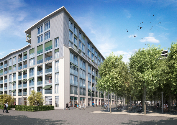 Haus Krokodil am Dialogplatz: Direkt am Dialogplatz gelegen, stellt das Krokodil das erste Wohnhaus der neuen Lokstadt dar. Das Haus Krokodil ist eine durchdachte Holzkonstruktion und schliesst vier verschiedene Wohnformen unter einem Dach um einen grünen Innenhof herum zusammen. Der Name geht auf die erste elektrische Gotthardlok zurück, die ebenso umweltfreundlich wie innovativ war. (Visualisierung: Implenia)