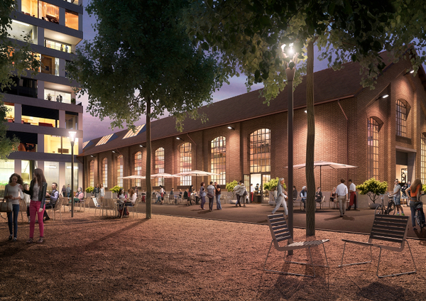 Abendlicher Treffpunkt am Dialogplatz beim Habersack: Die grosse, ehemalige Fabrikationshalle Habersack wird vollständig erhalten bleiben und einen belebten Durchgang zum Dialogplatz bilden. Sie wird Teil des gesellschaftlichen Zentrums der Lokstadt und unter anderem gastronomisch und als Markthalle genutzt. Der Name „Habersack“ geht auf eine SLM Dampflok zurück, die ihren Proviant an Kohle und Wasser selbst mitführte und deshalb keinen Versorgungswagen brauchte. (Visualisierung: Implenia)