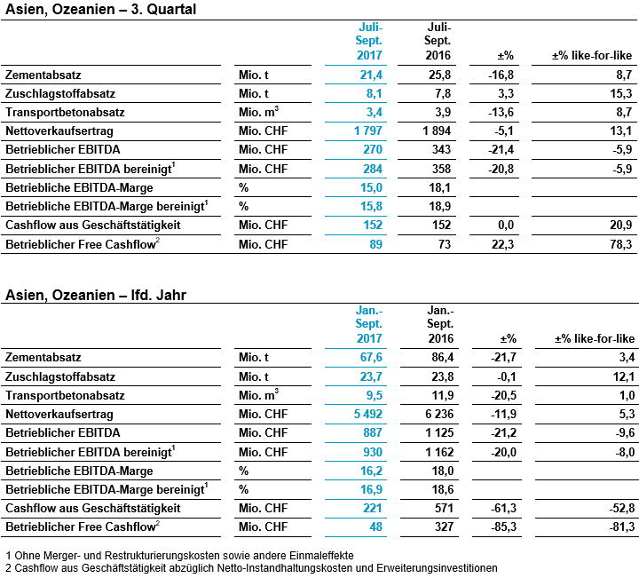 In der Region Asien, Ozeanien sank der bereinigte betriebliche EBITDA gegenüber dem Vorjahreszeitraum auf vergleichbarer Basis um 5,9 Prozent. Gleichzeitig stieg der Nettoverkaufsertrag auf vergleichbarer Basis um 13 Prozent. Indien setzte seine starke Entwicklung fort – in einer normalen Monsunsaison, die üblicherweise von einer schwachen Nachfrage geprägt ist. Die höheren Treibstoffkosten wurden durch höheren Absatz und höhere Preise mehr als ausgeglichen. Auf den Philippinen herrschten im Quartal weiterhin schwierige Marktbedingungen. Das Preisniveau ist niedriger als im Vorjahreszeitraum und einige grosse Infrastrukturprojekte der Regierung wurden verschoben. Das Management hat in der gesamten Region Asien, Ozeanien Massnahmen ergriffen und Initiativen gestartet, die auf Kosteneinsparungen, Anlagenoptimierung, Logistik und kommerzielle Transformation abzielen.