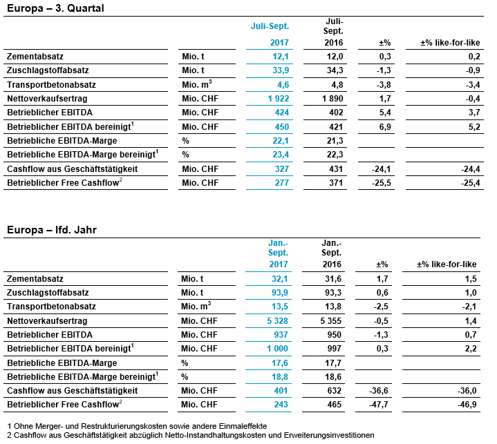 Auf vergleichbarer Basis legte der bereinigte betriebliche EBITDA in Europa gegenüber dem 3. Quartal 2016 um 5,2 Prozent zu. Starke Beiträge leisteten insbesondere Länder in Mittel- und Osteuropa, darunter auch Russland. Projektverzögerungen und ein allgemeiner Wirtschaftsabschwung liessen die Erträge in Grossbritannien auf Vergleichsbasis geringer ausfallen. In Frankreich blieben die zugrundeliegenden Trends solide, wobei die Zement- und Betonvolumen im Vergleich zur Vorjahresperiode stiegen. Zudem wurden weitere Fortschritte erzielt bei der Anpassung des industriellen Netzwerks. Die Nachfrage nach Zuschlagstoffen und Beton war in der Schweiz schwächer als in der Vorjahresperiode. Zahlreiche Grossprojekte wurden kürzlich abgeschlossen.