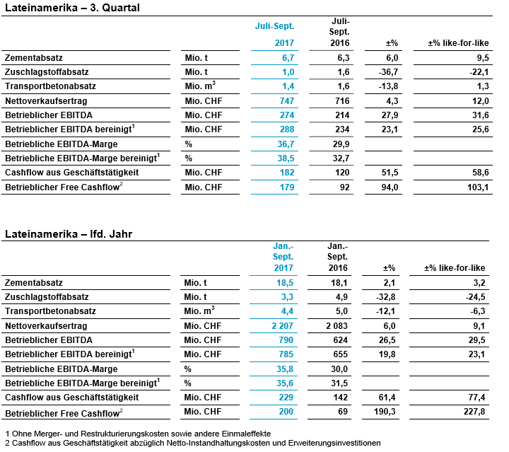 LafargeHolcim erzielte im 3. Quartal auf vergleichbarer Basis ein solides Wachstum des bereinigten betrieblichen EBITDA. Positive Beiträge leisteten Lateinamerika, Nordamerika und Europa. In den Regionen Asien, Ozeanien sowie Naher Osten, Afrika herrschten schwierige Marktbedingungen. Hier hat das Management Massnahmen ergriffen, um Schwachstellen in wichtigen Ländern anzugehen.