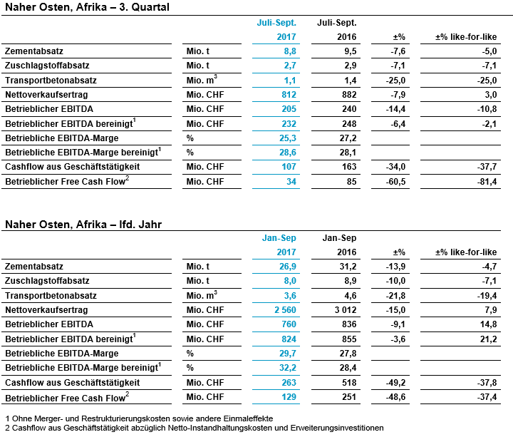 Der bereinigte betriebliche EBITDA in der Region Naher Osten, Afrika gab auf vergleichbarer Basis gegenüber dem Vorjahreszeitraum um 2,1 Prozent nach. Nigeria, das die Rezession langsam überwindet, konnte im Quartal gegenüber dem Vorjahreszeitraum wachsende Erträge verbuchen. Dabei wurden die höheren Kosten dank der günstigen Preise mehr als ausgeglichen. In Algerien verschlechterten sich die Wirtschaftsbedingungen im 3. Quartal. Dies hatte zur Folge, dass der Absatz im 3. Quartal deutlich schwächer ausfiel als im Vorjahreszeitraum.