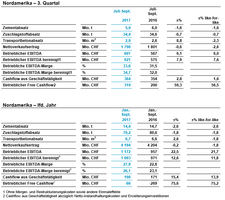 Auf vergleichbarer Basis stieg der Zementabsatz im 3. Quartal um 4,7 Prozent und im bisherigen Jahresverlauf um 1,8 Prozent. Auf Stufe Konzern erhöhten sich die Zementpreise im 3. Quartal gegenüber dem Vorjahr auf vergleichbarer Basis um 5,6 Prozent.
