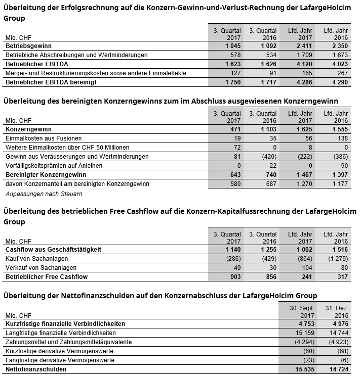 Der Konzerngewinn – Anteil Aktionäre LafargeHolcim Ltd stieg im bisherigen Jahresverlauf um 8,1 Prozent und betrug CHF 1 446 Millionen. Darin spiegelt sich der höhere bereinigte betriebliche EBITDA und ein tieferer effektiver Steuersatz in den ersten neun Monaten des Jahres 2017. Der Konzerngewinn – Anteil Aktionäre LafargeHolcim Ltd verringerte sich im Quartal auf CHF 433 Millionen, da im Vorjahreszeitraum höhere Veräusserungsgewinne erzielt wurden. Während sich der bereinigte Konzerngewinn seit Jahresbeginn um 7,9 Prozent auf CHF 1 270 Millionen verbesserte, war im 3. Quartal ein Rückgang auf CHF 589 Millionen zu verbuchen.
