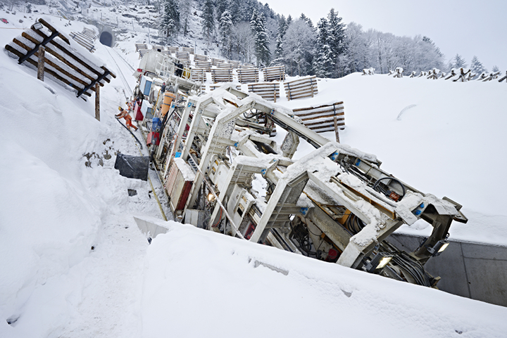 Vortriebsbohrmaschine vor der Einfahrt in den zweiten Tunnel. Das Gelände weist eine maximale Steigung von bis zu 110 Prozent auf und forderte von den Mannschaften vor Ort hohe Disziplin auch beim Thema Arbeitssicherheit. (Bild: Implenia)