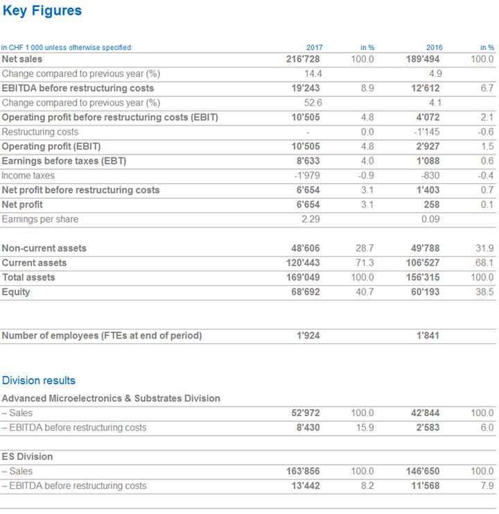 Bronschhofen, March 8, 2018 – Cicor (SIX Swiss Exchange: CICN), a leading international technology company in the field of printed circuit boards, microelectronics and EMS (Electronic Manufacturing Services) with its head office located in Boudry (Switzerland), confirmed the turnaround it had experienced in the previous year. Both divisions recorded double-figure sales growth, increasing group sales by 14.4% to reach CHF 216.7 million (2016: CHF 189.5 million). The ongoing momentum in order intake is particularly gratifying, rising by 5.4% in comparison with the previous year and reaching CHF 235.5 million (2016: CHF 223.5 million). The book-to-bill ratio was therefore 1.09, suggesting that continued growth is likely in 2018. EBIT in the year under report has grown by 259% to CHF 10.5 million (2016: CHF 2.9 million). A net result of CHF 6.7 million or 3.1% of sales was posted (2016: CHF 0.3 million, 0.1%). This result, combined with a positive free cash flow of CHF 2.7 million (2016: CHF -1.4 million), means that Cicor is once again able to pay dividends.
