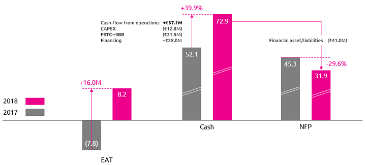 lm group’s balance sheet remains strong. Despite an extraordinary investment of approx. €31.5M to finance the share buyback and the Partial Self-Tender Offer (PSTO), the cash available at the end of the year was nearly 40% higher than at 1st of January, thanks to the cash generated from the operations and the availability of credit lines negotiated to finance the above mentioned investments.
