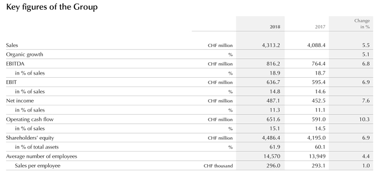 - Net income up +7.6 % to CHF 487.1m; return on sales 11.3% (2017: 11.1%)