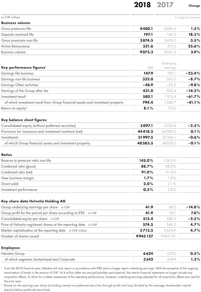 [1] Following the successful integration of the acquisitions from 2014, Helvetia has only reported in accordance with IFRS since its 2018 interim financial statements and no longer reports underlying earnings. The 2018 annual financial statements no longer include any acquisition effects with the exception of the amortisation of the bonds to par acquired as part of the acquisition of Nationale Suisse, which is continuing beyond the integration period and is thus still included in the 2018 IFRS annual result. To allow for a better assessment of the operating performance, Helvetia compares the 2018 IFRS annual result with the underlying earnings after tax generated in financial year 2017 adjusted for all acquisition effects.