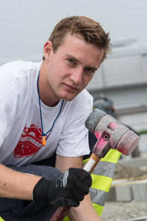 Dominic Zähner (19), Strassenbauer bei Implenia in St. Gallen, pflästert an den WorldSkills 2013 in Leipzig. (Foto: Implenia)