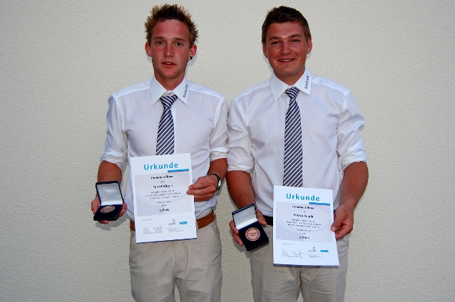 Stolze Drittplatzierte an den WorldSkills 2013: Hinter zwei deutschen Teams erreichten die beiden Schweizer Dominic Zähner (links, Implenia) und Patrick Bürgin (rechts, Ruepp AG) im Strassenbau-Präsentations-Wettbewerb Rang 3. (Foto: Fachverband Infra Schweiz)