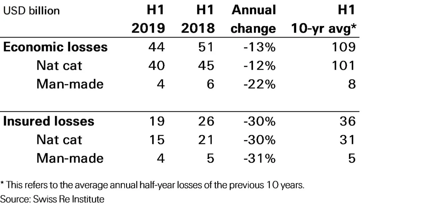 Global economic losses from natural catastrophes and man-made disasters in the first half of 2019 amounted to USD 44 billion, according to Swiss Re Institute's preliminary sigmaestimates. This figure is well below USD 109 billion, the average first-half economic losses of the previous ten years. It is also lower than the losses of USD 51 billion reported for the same period a year earlier. Of the total global economic losses in the first half of 2019, USD 19 billion were covered by insurance, the main driver being thunderstorms and flooding events in different parts of the world. More than 5 000 people lost their lives or went missing in disaster events during the period.