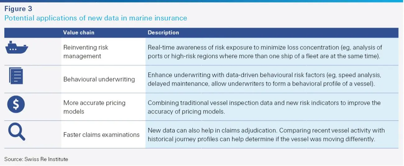 In marine, insurers can now use detailed behavioural and situational data on over 100,000 vessels to identify risky behaviour and monitor risk concentration, opening the path towards "pushing" the insured to improved preventative measures (See Figure 3).
