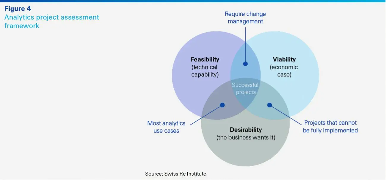 Successful implementations of analytics projects start with insurers asking the right questions on value propositions and data sources e.g., how to identify areas where analytics generate tangible value; how to build a holistic data strategy; what are the success criteria (e.g., ROI and time horizon)? One useful framework to determine the value of projects is to evaluate them across desirability, feasibility and viability (See Figure 4). Insurers should focus initially on areas where there is high potential on all three fronts.