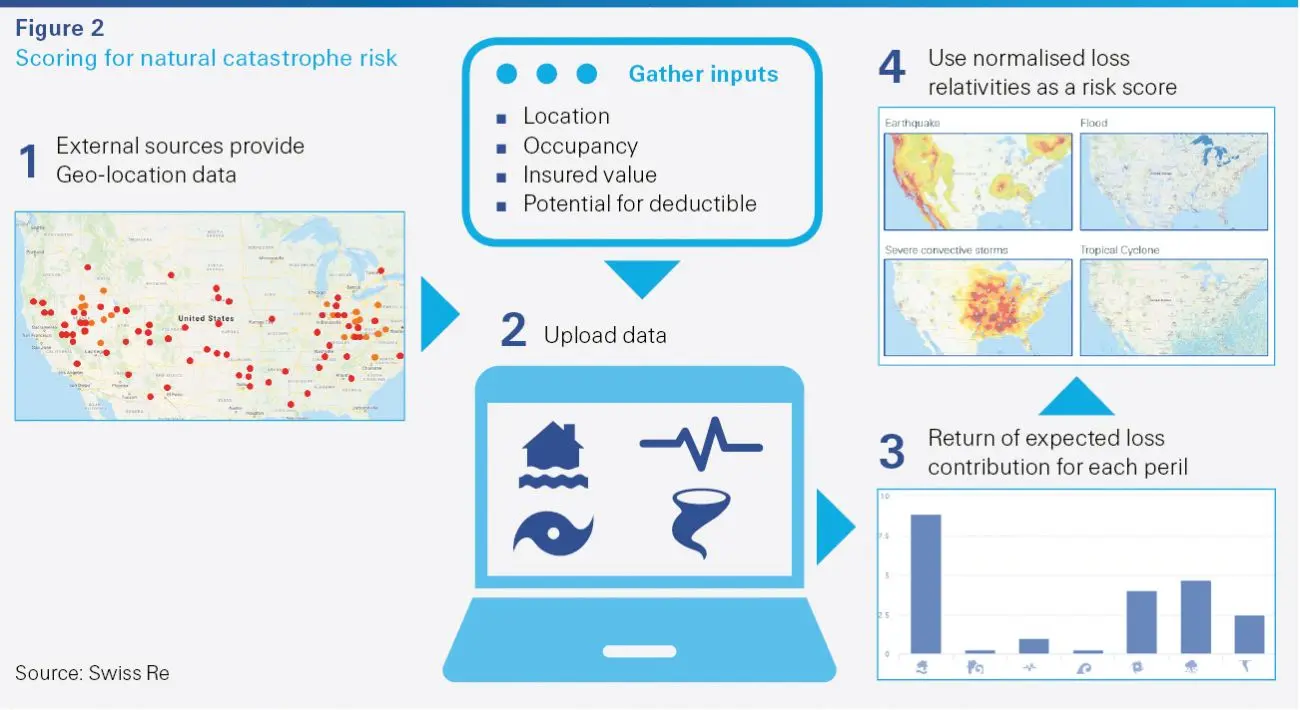 In commercial property, insurers are using data to auto-fill underwriting criteria for new business and renewals and moving towards virtual inspection platforms. Data about location and occupancy can be modelled to produce risk scores that enable underwriters to base risk selection and price on market-wide experience (see figure 2).