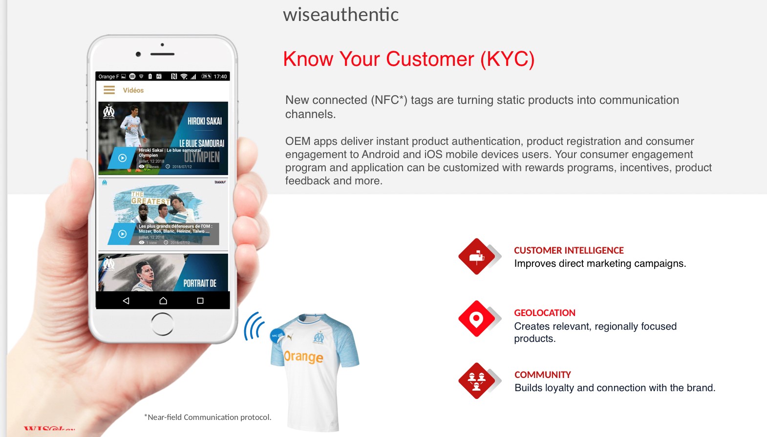 - Protect their brand: WISeKey's WISfans now comes with the Company's award winning WISeAuthentic original module for digital brand protection. This module allows sports clubs to identify, authenticate and track any of their branded sports items secured with an NFC tag equipped with WISeKey's NanoSealRT or VaultIC155 secure chip. Additionally, WISfans allows fans to validate the authenticity of the merchandise they are about to purchase, or they already own, using an Android or Apple (with iOS11 or above) smartphone.