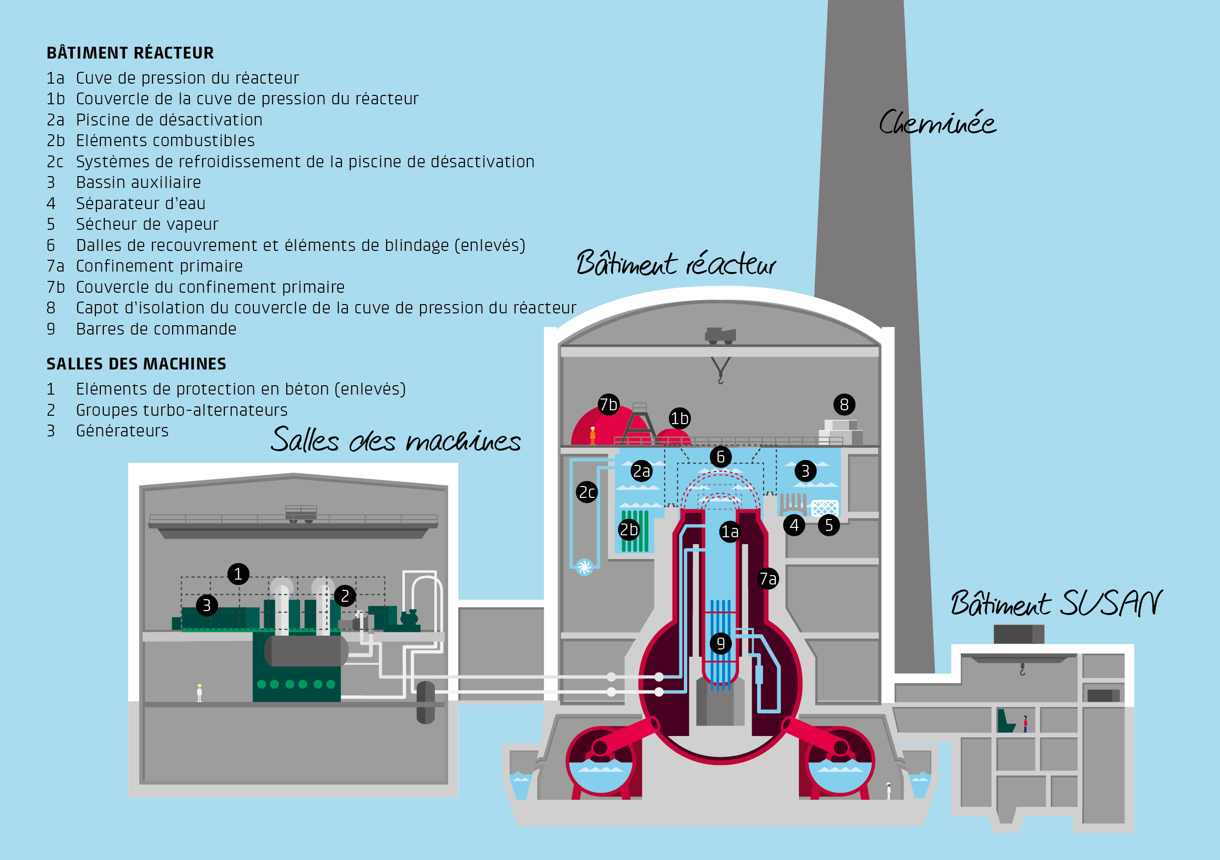 Après l'arrêt de l'exploitation de la centrale nucléaire de Mühleberg (CNM) le 20 décembre 2019, le démantèlement a commencé comme prévu le 6 janvier 2020. Travaux dans le bâtiment réacteur Fin mars 2020, la cuve de pression du réacteur a été ouverte et tous les éléments combustibles ont été acheminés vers la piscine de désactivation. La cuve de pression du réacteur était tout d'abord restée fermée pendant trois mois après l'arrêt de l'exploitation, ce qui a d'ores et déjà permis de diviser la radioactivité par 1000 pendant cette période. Les éléments combustibles continueront de refroidir dans la piscine de désactivation au cours des prochaines années, jusqu'à ce qu'ils puissent être transportés vers le centre de stockage intermédiaire de Würenlingen. En outre, dans le bâtiment réacteur, les dalles de recouvrement et des éléments de blindage en béton ont été retirés de la cavité du réacteur et désassemblées sur place. Ces éléments de béton pesaient au total près de 400 tonnes. Lorsque la centrale était en fonctionnement, ils constituaient un blindage contre la radioactivité. Dans les mois à venir, le couvercle du confinement primaire et le capot d'isolation thermique du couvercle de cuve seront aussi désassemblés sur place. Par ailleurs, le système supplémentaire de refroidissement de la piscine de désactivation ajouté en 2016 va être transformé en système de sécurité. Ces travaux dureront jusqu'à fin septembre 2020. Leur achèvement correspondra à la «mise hors service définitive» de la CNM. Travaux dans la salle des machines Dans la salle des machines, les travaux ont aussi démarré dès le début de l'année 2020. Le démontage des deux groupes turbo-alternateurs et des générateurs a débuté en vue de l'installation de systèmes pour le traitement des matériaux. Ces systèmes auront pour objectif de traiter les matériaux de manière à pouvoir séparer les résidus radioactifs des matières non radioactives. De plus, 165 éléments de béton d'un poids total de 1300 tonnes protégeant des éclats en cas de rupture de turbine ont déjà été transportés hors de la salle des machines après avoir subi toutes les mesures de libération requises en matière de radioactivité.