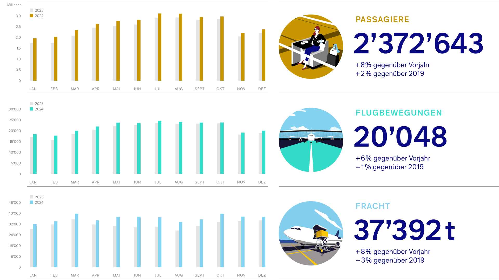 Die Passagierzahlen 2024 liegen praktisch auf Vorkrisenjahr 2019. Auf Jahresbasis ist das Jahr 2024 das zweitstärkste Jahr nach 2019 in der Flughafengeschichte. Die Anzahl Flugbewegungen lag 2024 bei 261’103, dies entspricht einem Plus von 6% im Vergleich zu 2023. Gegenüber 2019 liegt die Anzahl Flugbewegungen bei rund 95%. Die Passagierzahlen stiegen damit stärker an als die Anzahl der Flugbewegungen. Als Folge stieg die Sitzplatzauslastung 2024 im Vergleich zu 2019 um 2,5 Prozentpunkte auf 80.6%. Grund dafür ist, dass zum einen grössere Flugzeuge eingesetzt wurden und zum anderen die Flugzeuge besser ausgelastet sind.