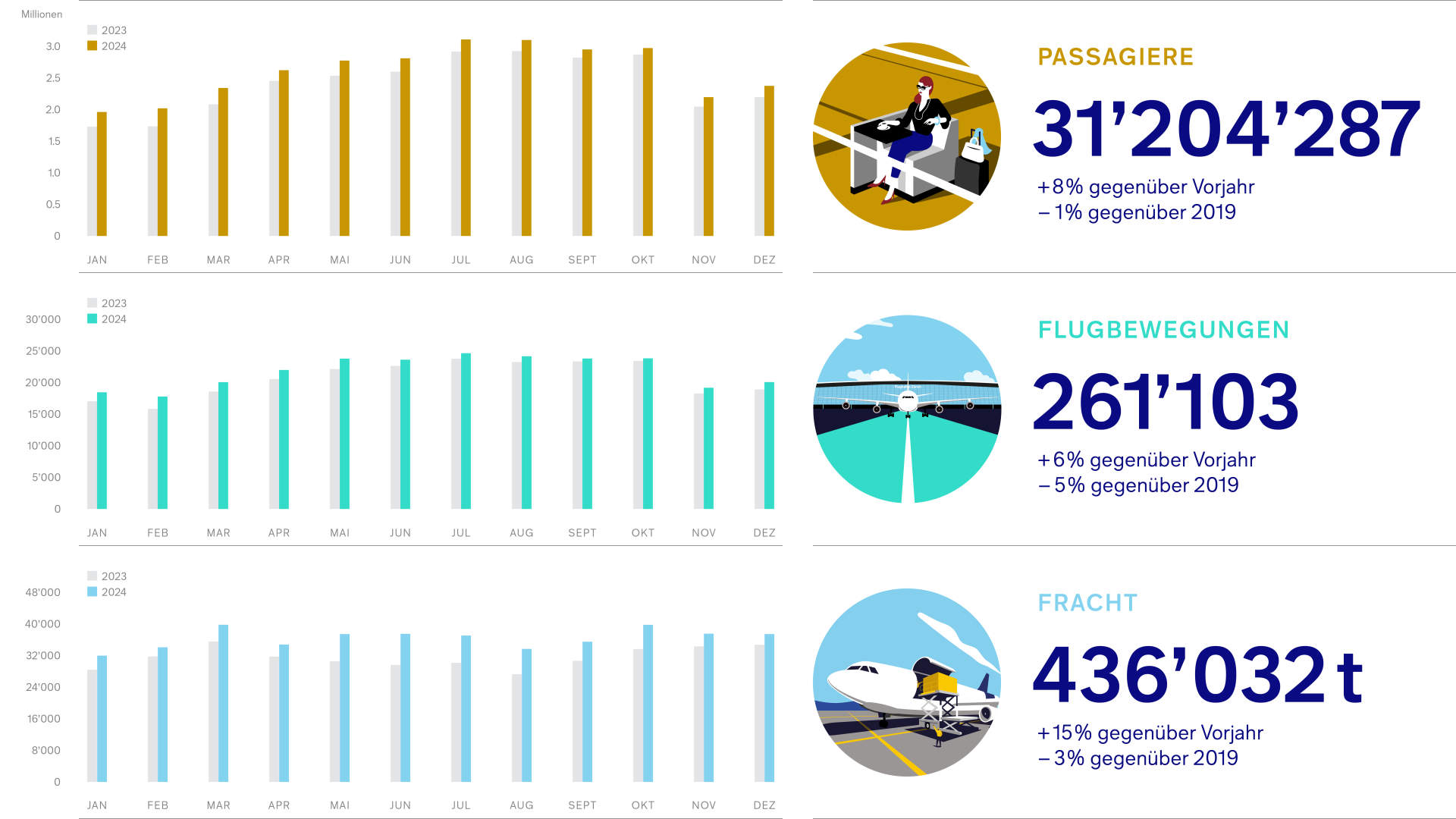Im Jahr 2024 sind 31.2 Millionen Passagiere über den Flughafen Zürich geflogen. Im Vergleich zum Vorjahr entspricht dies einer Zunahme von 8%. Gegenüber 2019 lagen die Passagierzahlen bei 99%.