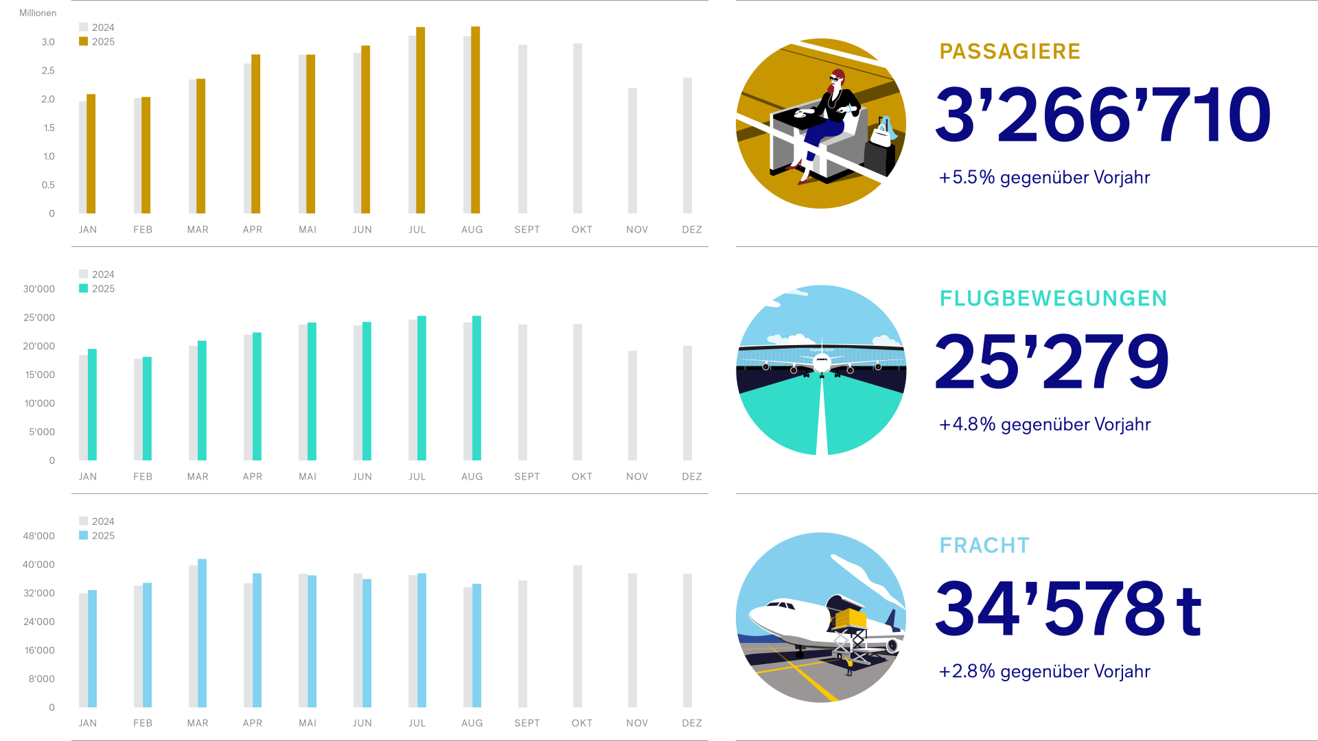 Die Anzahl der Lokalpassagiere lag im August 2025 bei 2’292’111. Der Anteil der Umsteigepassagiere betrug 29.7%, was 969’288 Passagieren entspricht. Wie bereits im Vormonat Juli war auch der August stark vom Ferienreiseverkehr geprägt. Nebst dem Höchstwert auf Monatsbasis wurde am 3. August mit 115'587 Passagieren zudem ein neuer Tageshöchstwert verzeichnet (+40 Passagiere im Vergleich zum bisherigen Höchstwert vom 28. Juli 2025).