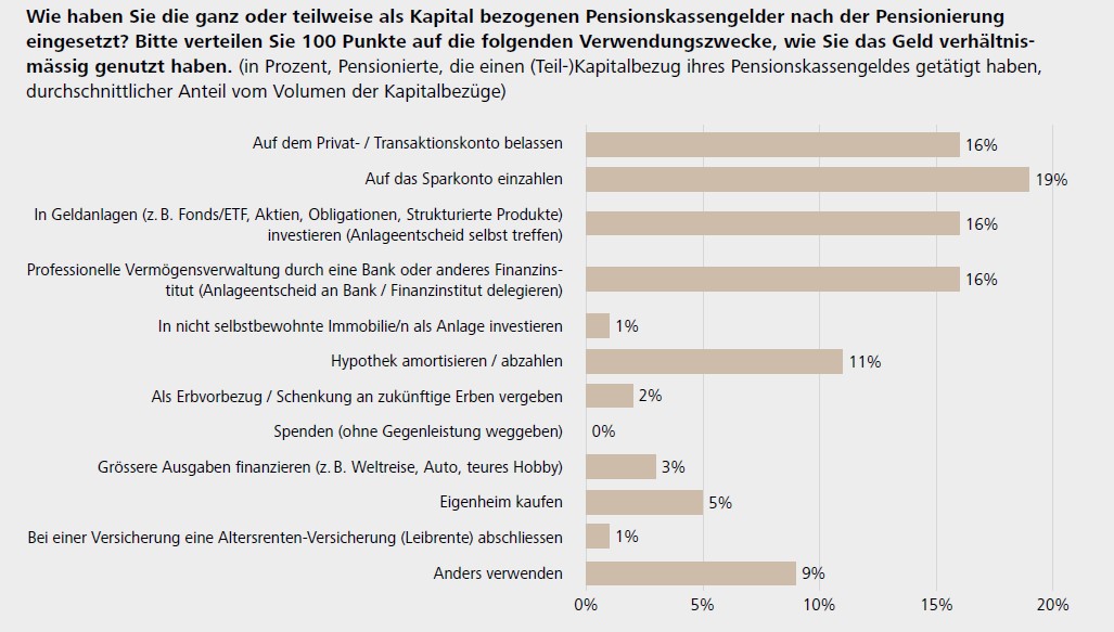 Neben Wissenslücken bestehen auch Irrtümer. Lediglich 38 Prozent der Befragten wissen, dass Pensionskassen die Vorsorgegelder an den Finanzmärkten investieren und der grösste Teil der Altersleistungen aus den Erträgen dieses dritten Beitragszahlers stammt. 29 Prozent sind gar der Ansicht, dies sei nicht der Fall. «Dass gerade die Renditen des dritten Beitragszahlers entscheidend für die Stabilität des Altersvorsorgesystems sind, scheint den wenigsten bewusst zu sein. Das könnte mitunter ein Grund dafür sein, weshalb viele ihr freies Vermögen kaum oder überhaupt nicht anlegen», schlussfolgert Gumbatshang. Befragte im Rentenalter, die ihr Pensionskassenguthaben ganz oder teilweise als Kapital bezogen haben, parkierten im Schnitt 35 Prozent des bezogenen Kapitals auf einem Konto, 33 Prozent wurden investiert und 11 Prozent zur Amortisation einer Hypothek genutzt. Hierbei zeigt sich ein Zusammenhang zwischen Vorsorgewissen und Anlageverhalten. Personen mit höherem Vorsorgewissen investieren ihr Geld häufiger, während Personen mit geringerem Wissen das Konto bevorzugen.