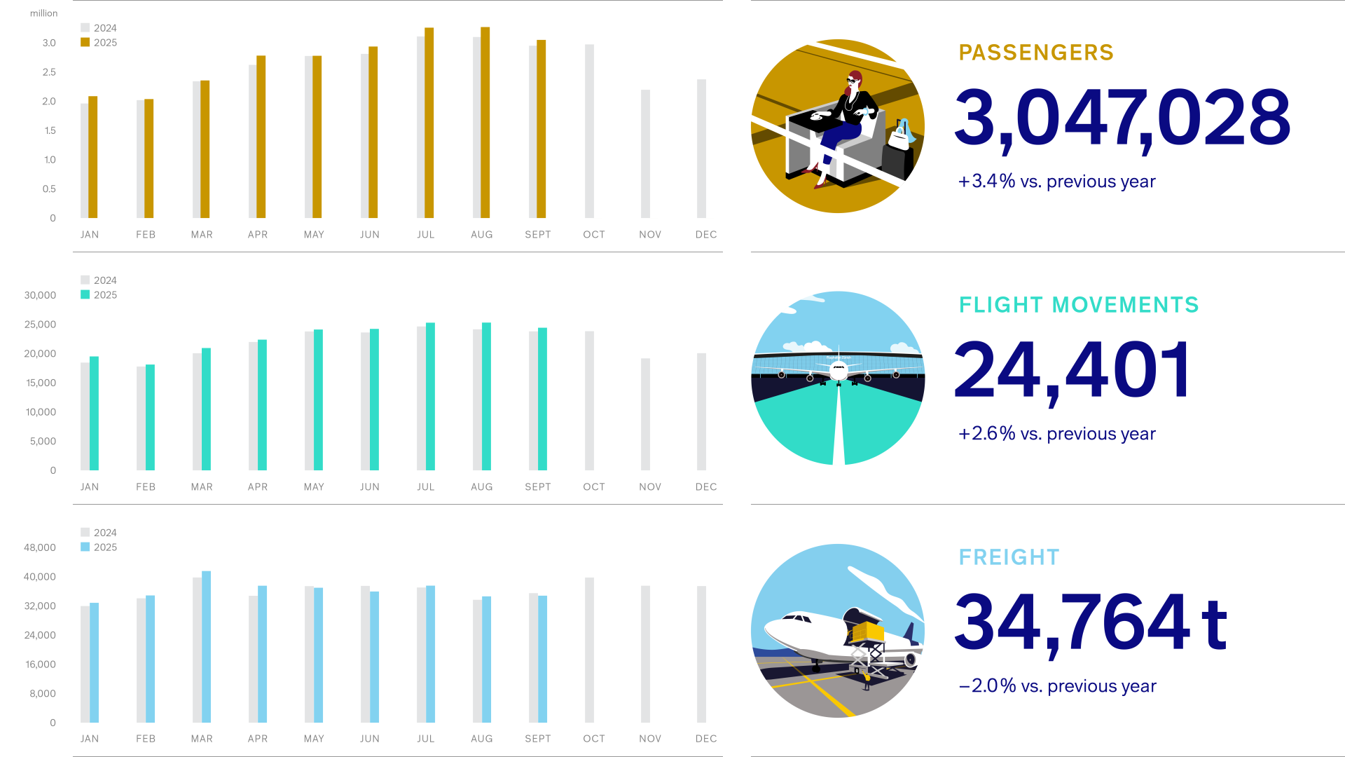 In September 2025, 3,047,028 passengers passed through Zurich Airport, corresponding to an increase of 3.4% compared to last year.