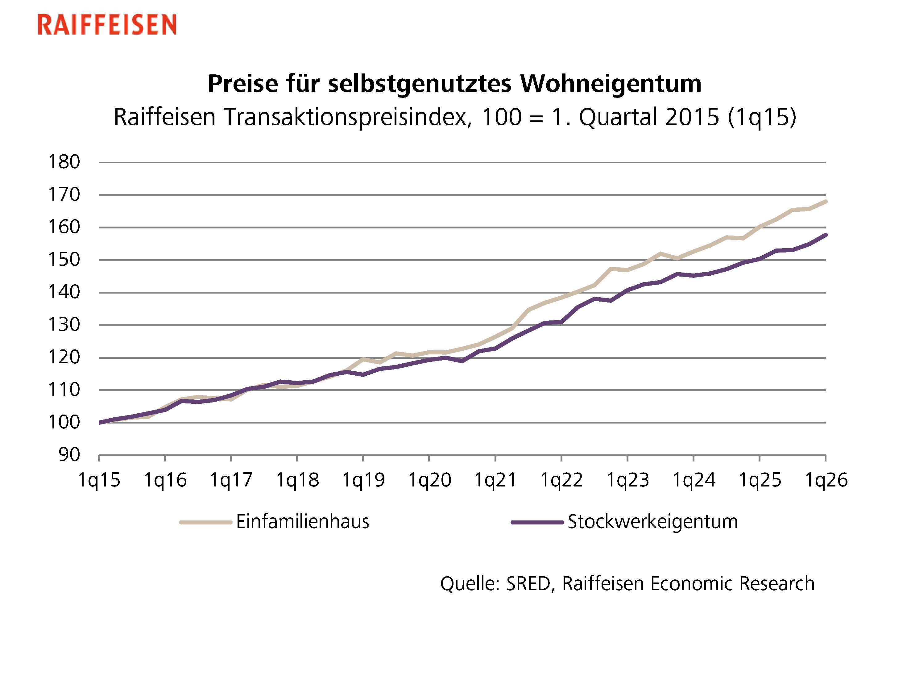 St.Gallen, 10. April 2026. Die Preise für selbstgenutztes Wohneigentum sind im ersten Quartal 2026 weiter gestiegen. Für Einfamilienhäuser musste 1,4 Prozent mehr bezahlt werden als im Vorquartal. Stockwerkeigentum ist mit einem Plus von 1,8 Prozent ebenfalls erneut teurer geworden. Gegenüber dem ersten Quartal 2025 verteuerten sich sowohl Einfamilienhäuser als auch Eigentumswohnungen um 4,9 Prozent. «Die anhaltend tiefen Zinsen ermöglichen mit dem Kauf von Wohneigentum in vielen Regionen deutliche Einsparungen gegenüber dem Wohnen zur Miete. Die hohe finanzielle Attraktivität von Wohneigentum hält die Preisdynamik weiterhin hoch», erklärt Fredy Hasenmaile, Chefökonom von Raiffeisen Schweiz.
