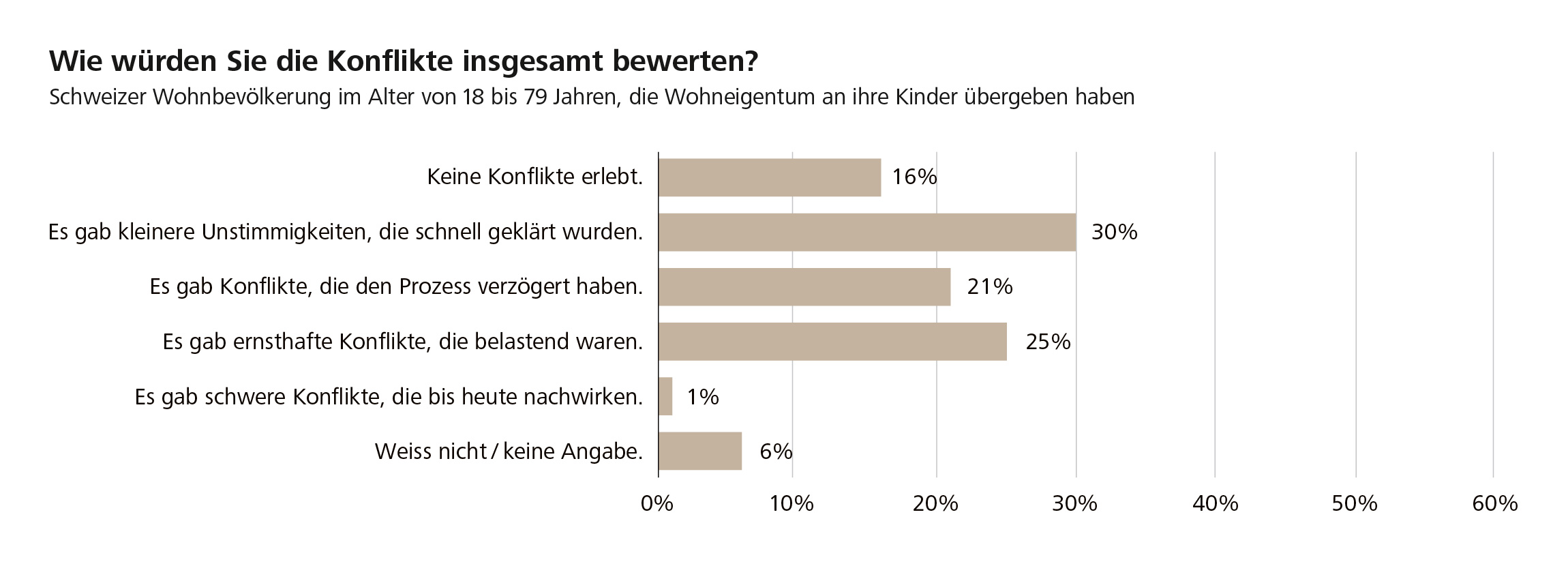 Die Umfrage zeigt, dass Konflikte im Weitergabeprozess häufig sind: Gut 80 Prozent der Übergebenden, rund die Hälfte der Übernehmenden und etwa zwei Drittel der Geschwister von Übernehmenden erlebten gemäss eigenen Angaben Auseinandersetzungen. Meist handelt es sich allerdings um kleinere Dispute; schwere Konflikte wurden selten vermerkt. Besonders häufig drehen sich Meinungsverschiedenheiten um den Preis der Immobilie, ihren Zustand oder den Zeitpunkt der Übergabe. Auch unter Geschwistern kann es zu Spannungen kommen, etwa bei der Frage, wer das Wohneigentum übernimmt. Ein häufiger Grund für Meinungsverschiedenheiten ist die Reglung von Ausgleichszahlungen. Fast 30 Prozent der Übernehmenden mit Geschwistern berichten von Auseinandersetzungen zu diesem Thema. «Wir raten dringend dazu, Betrag und Zeitpunkt der Ausgleichszahlung bereits bei der Weitergabe in einem Erbvertrag klar festzulegen. Sinnvoll kann zudem sein, zugunsten der nicht übernehmenden Geschwister ein Gewinnanteilsrecht oder ein Vorkaufsrecht einzuräumen», erklärt Erbschaftsexperte Rehefeldt.